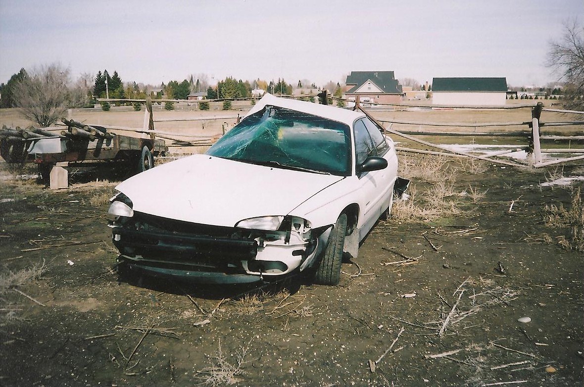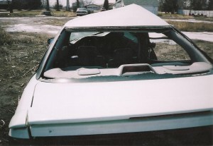 right by my side. I hated this exercise. Any movement caused more pain. I stopped and looked out the window and saw our car. “When did they bring that here?'” I asked Dan. He said “They brought it on a big truck a couple of days ago.” I couldn’t believe my eyes. I felt like it was an enemy sitting in the yard. I didn’t want to look, but at the same time I couldn’t get my eyes off it. After all it did play a big part in saving my life. We had to pay for each day it sat in the wrecking yard, so they brought it to the house until the insurance company totaled it and hauled it off. My wonderful neighbor and friend went and took pictures of it for us. I couldn’t even look at them for a while. Now I keep them in a special place and take them out every now and then. I cry when I do.